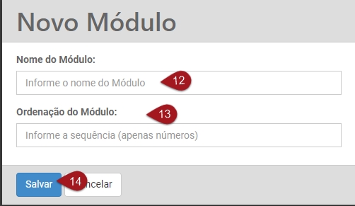 Nº 12 – Escolha o nome do módulo Nº 13 – Escolha a ordenação do módulo, sendo número 1 o módulo irá aparecer no topo da lista, 2 em segundo e assim por diante em ordem crescente Nº 14 – Clique em Salvar para criar o módulo.