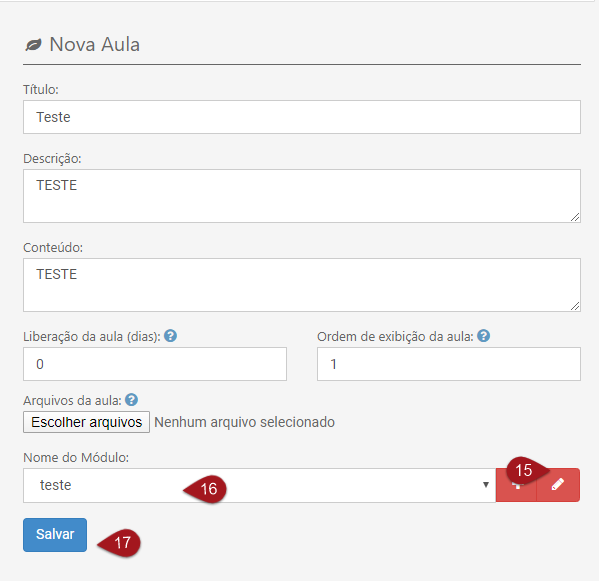 Nº 15 – Escolha o módulo que criou para inserir a aula Nº 16 – Após selecionar o módulo é possível editá-lo clicando nesta opção Nº 17 – Depois de preencher todas as informações da aula clique em Salvar para criá-la.