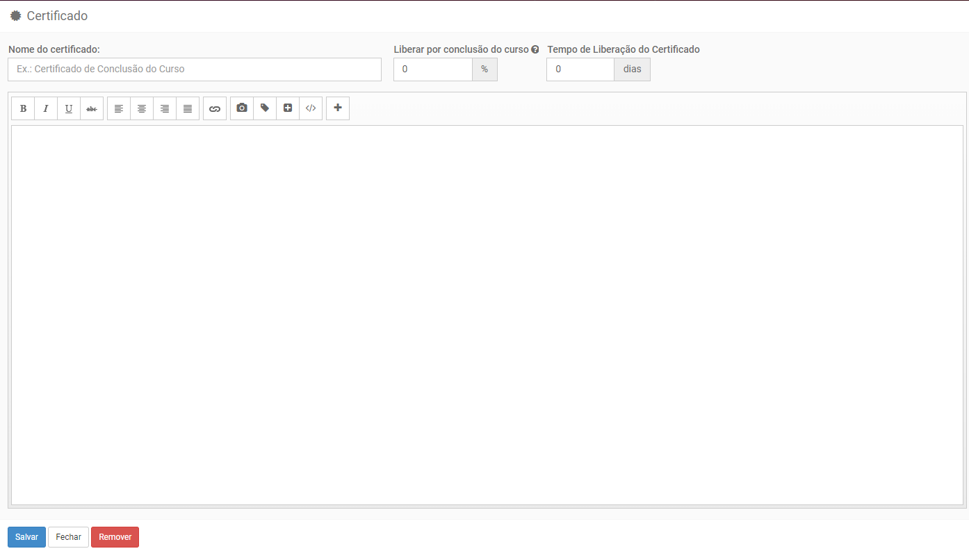 Esta é a edição do Certificado, nela você pode criar um do zero ou inserir um já feito através de HTML clicando na opção </>