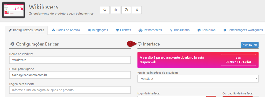 Nº1– Dentro do produto, acesse a aba configurações básicas e acesse a área de “Interface”.