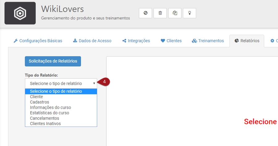 Nº 4 – Em Tipo de Relatório você deve escolher qual relatório deseja, as opções possíveis são Cliente, Cadastros, Informações do curso, Estatísticas do curso, Cancelamento, Clientes Inativos.