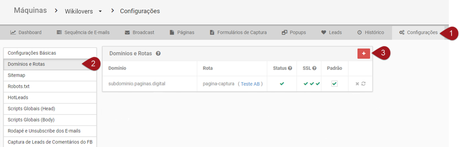 – O sistema não permite que o mesmo domínio/subdomínio esteja em mais de uma Máquina ou Produto EAD ao mesmo tempo. Por exemplo, se adicionar o dominio.com.br na Máquina A, não será possível adicionar o dominio.com.br na Máquina B ou em um Produto EAD. Nesse caso, recomendamos a criação de subdomínios.