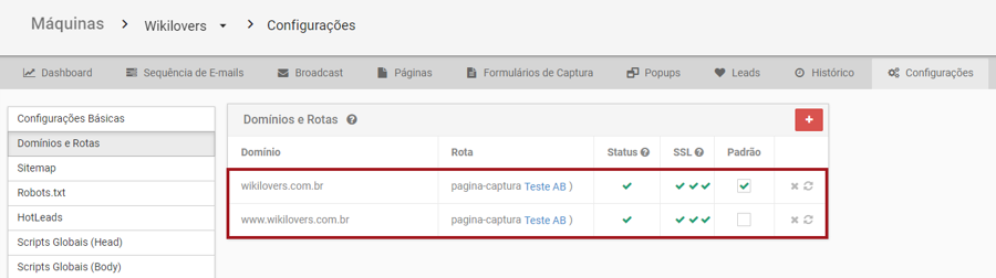 Por exemplo: para que o lead possa acessar wikilovers.com.br e também www.wikilovers.com.br, é preciso fazer o mesmo procedimento adicionando o domínio das duas formas. O resultado ficará similar ao da imagem abaixo: