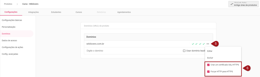 Nº6– Para ativar o certificado de segurança, marque as duas caixinhas com as opções “Criar um certificado SSL/HTTPS” e “Forçar HTTP para HTTPS”.