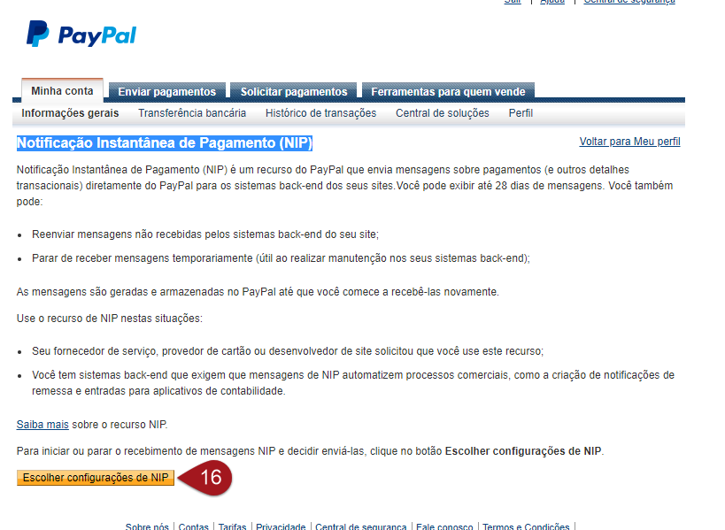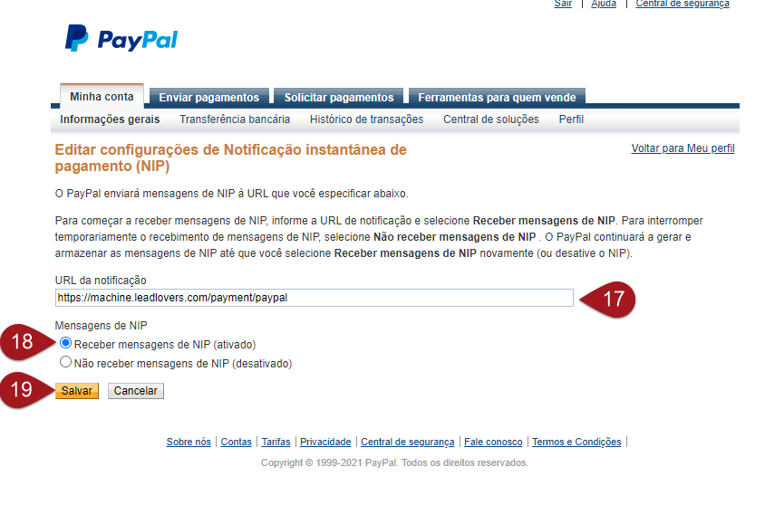 Nº15– Na seção “Notificações instantâneas de pagamento” iremos atualizar os dados.