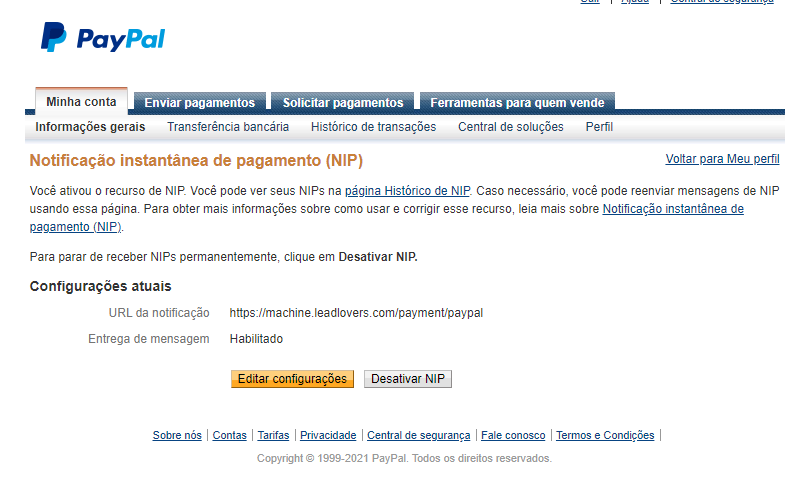 Agora iremos realizar configurações somente no PayPal.