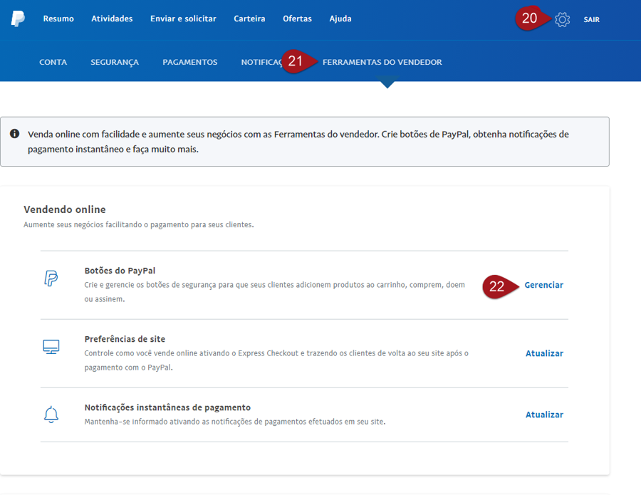 Nº22– Na seção “Botões do PayPal”, clique em “Gerenciar”.