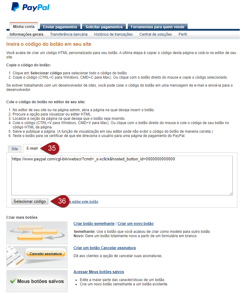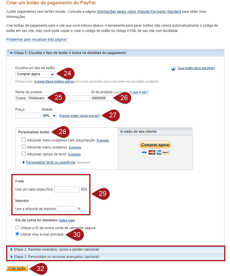 Nº28– Caso decida personalizar o botão, somente será possível inserir o botão de compra pelo código HTML. Se quiser gerar também um link para compra, não faça nenhuma alteração nesta seção.