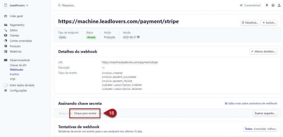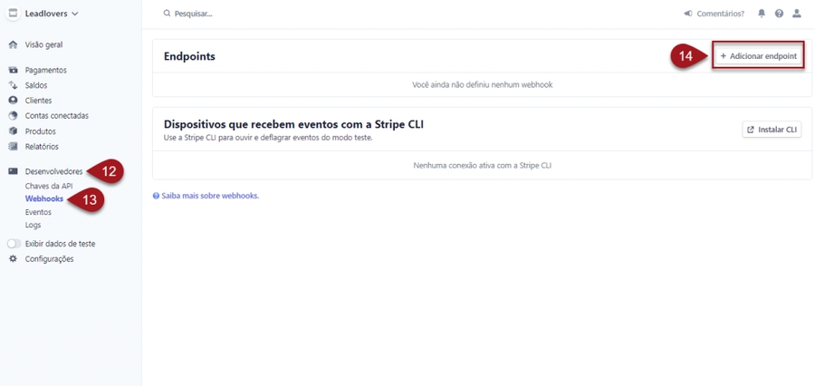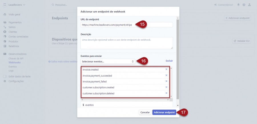 Nº15– Em URL do endpoint, cole a URL de Notificação do WebHook Stripe que você copiou no passo 11 deste tutorial. Nº16– Em Eventos para enviar, você deve selecionar qual evento dentro do produto criado na Stripe fará a ativação deste webhook.