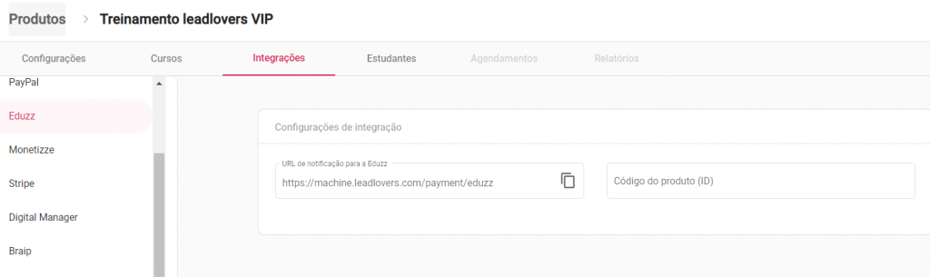 Nº4– Localize a opção Integração com o Eduzz e copie a URL de notificação. Essa URL será utilizada na Eduzz, salve em um bloco de notas.