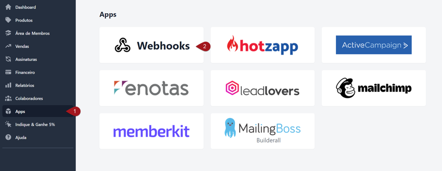 Nº1– Já logado em sua conta Kiwify, clique sobre a opção **“**Apps” no menu lateral esquerdo.