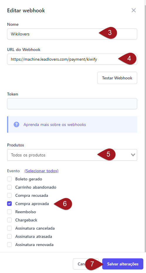 Nº6– Atualmente essa integração é válida somente para o evento “Compra aprovada”, então marque apenas ele.