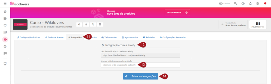 Nº11– Agora voltando para a leadlovers, acesse o seu produto EAD e vá até a aba **“**Integrações”.