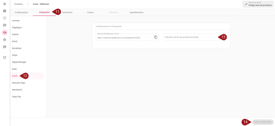 Nº12– Role a página até localizar o campo **“**Integração com a Kiwify”.