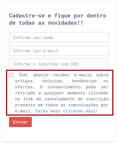 Toda e qualquer captura deve estar acompanhada de um campo no formulário, uma checkbox (caixa de seleção) ou um campo de escolha, que permita que o lead expresse seu consentimento de maneira explícita e direta.