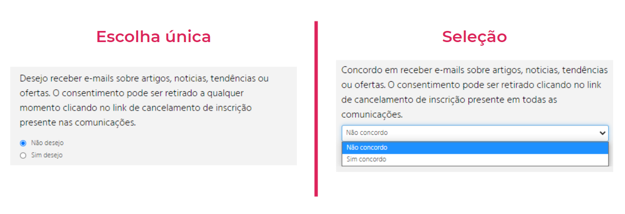 Importante: No caso do uso da opção de escolha em seu formulário, de acordo com a lei, a opção padrão precisa ser sempre a negativa (não, não aceito, não concordo, etc.).