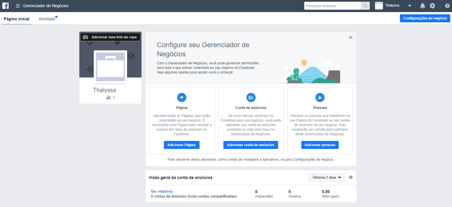 Essa será a primeira tela que aparecerá para você ao entrar no facebook Business. Caso você tenha algum anúncio criado, aparecerá em “Visão geral de anúncios”.