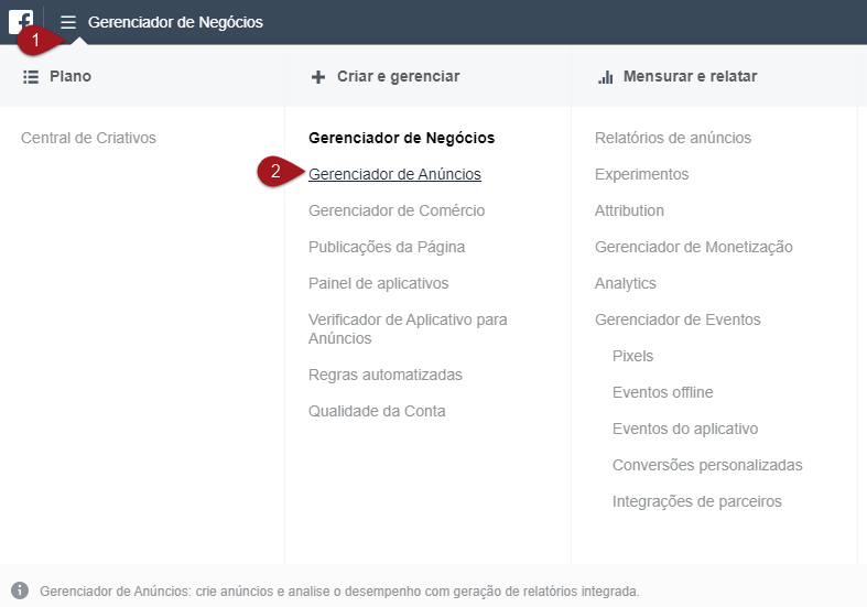 Nº 2 – Na coluna Criar e gerenciar escolha a opção Gerenciador de Anúncios;