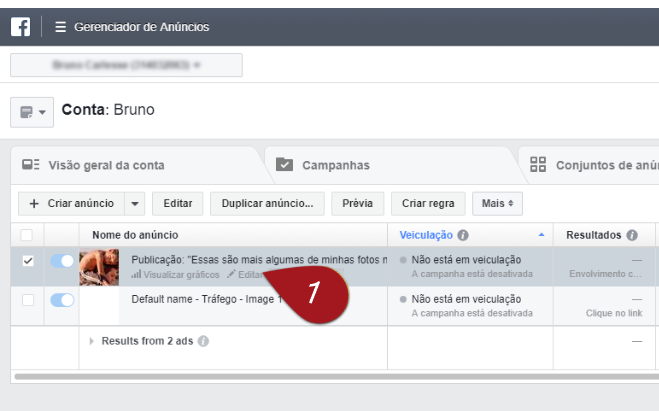 Nº 1 – Coloque o mouse em cima do anúncio que deseja compartilhar o link e clique em Editar;