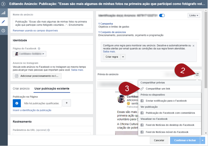 Nº 2 – Na pop-up que vai aparecer localize a Prévia do anúncio, então clique no local indicado; Nº 3 – Clique em Compartilhar um link;