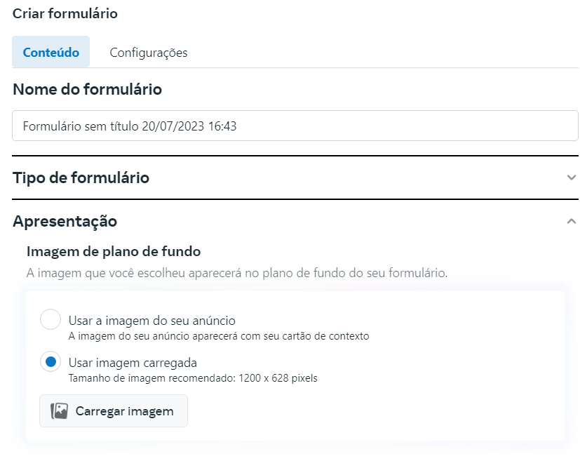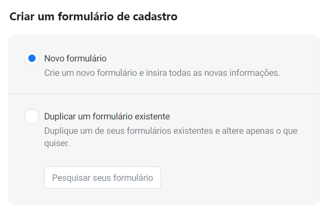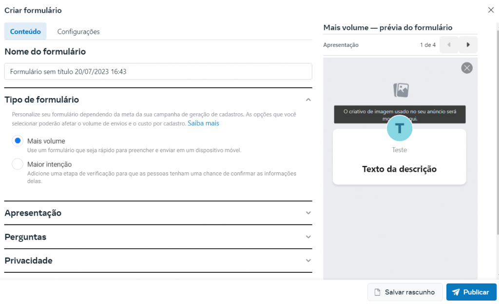 Agora, você está no criador de formulários para o Facebook.