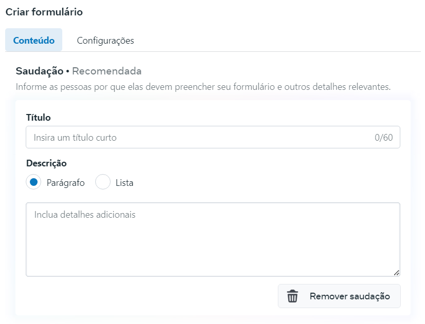 8 – Em Saudação, Escreva um texto para informar o objetivo desse formulário.