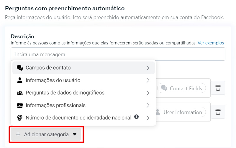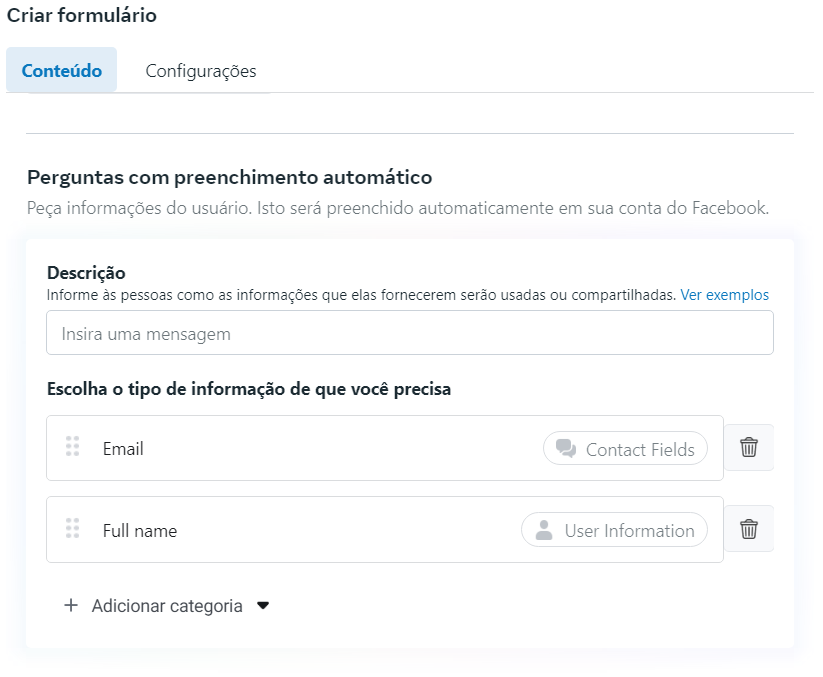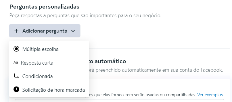 Em caso de perguntas personalizadas, é preciso criar os campos dinâmicos na ferramenta, exatamente igual aos do formulário do Facebook.