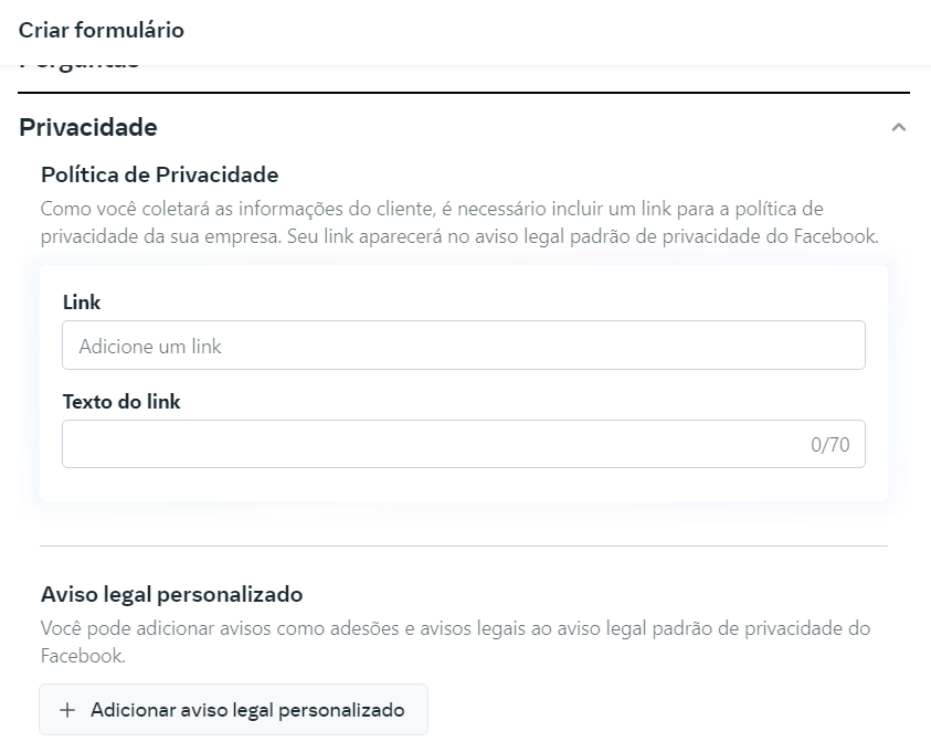 11 – Em Privacidade, Como você coletará as informações do cliente, é necessário incluir um link para a política de privacidade da sua empresa. Seu link aparecerá no aviso legal padrão de privacidade do Facebook, devido as normas da lei LGPD.\