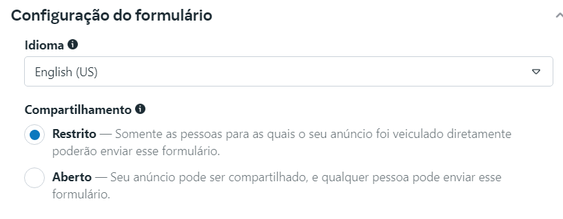 **13 –**Em idioma, escolha o idioma desejado e em Compartilhamento, escolha se será aberto ou restrito.