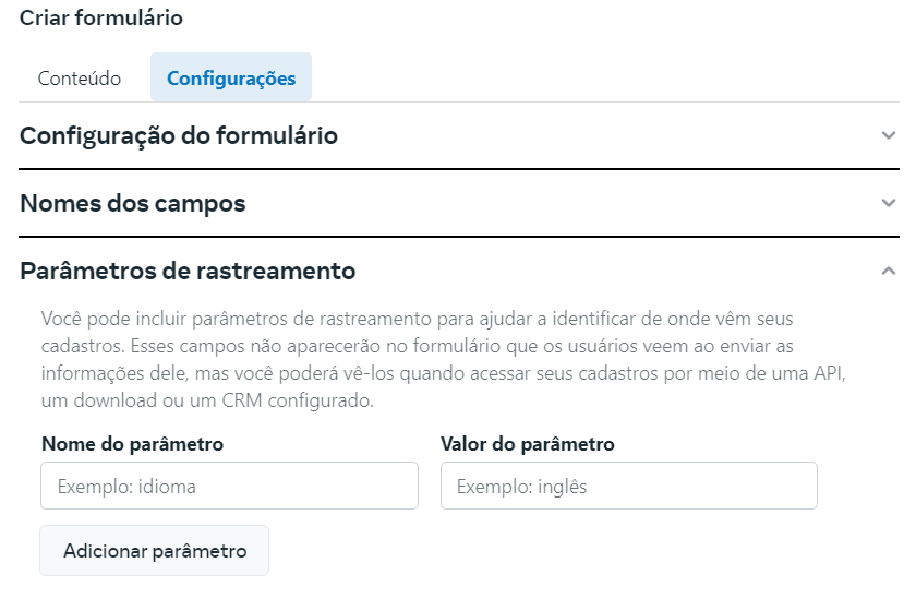 14- Você pode incluir parâmetros de rastreamento para ajudar a identificar de onde vêm seus cadastros. Esses campos não aparecerão no formulário que os usuários veem ao enviar as informações dele.