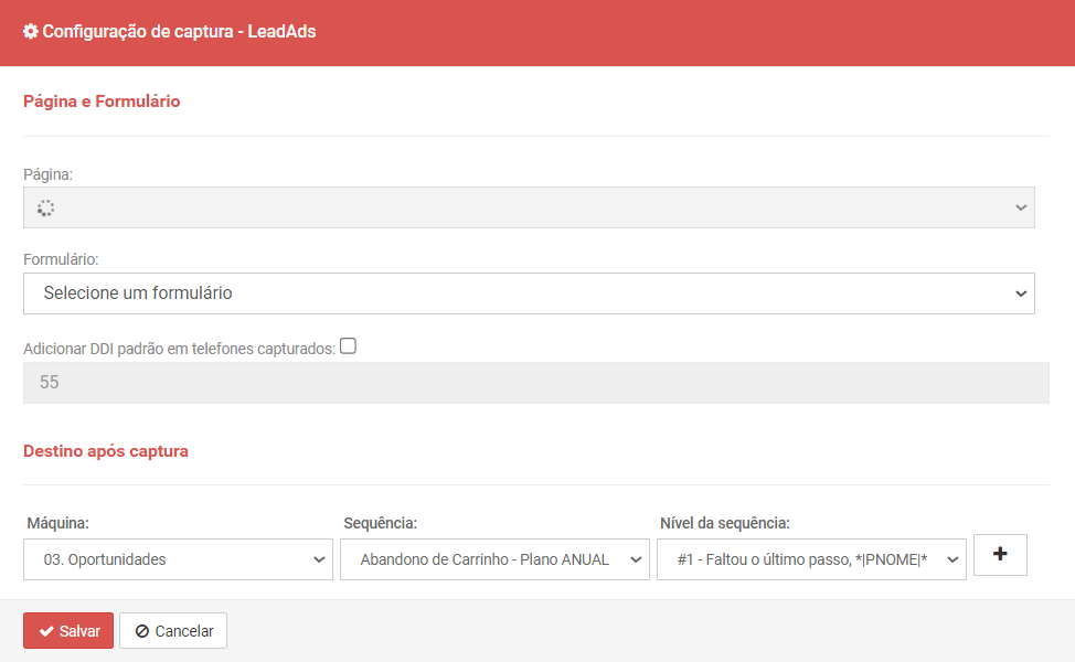 22- Em destino de Captura, Nos campos dessa opção, defina o destino do lead dentro da sua conta (máquina, funil e sequência).