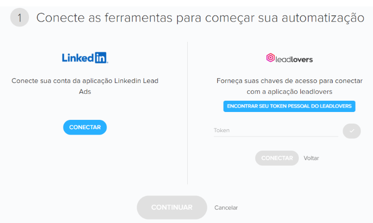 N2º Em seguida, você vai precisar conectar a sua conta da leadlovers e do Linkedin para que a Pluga consiga integrar as duas ferramentas