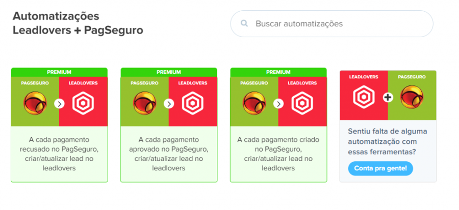 Acessando a página do leadlovers na Pluga, você terá uma variedade de possíveis integrações, utilize a barra de busca para localizar a Pagseguro, ou clique aqui.