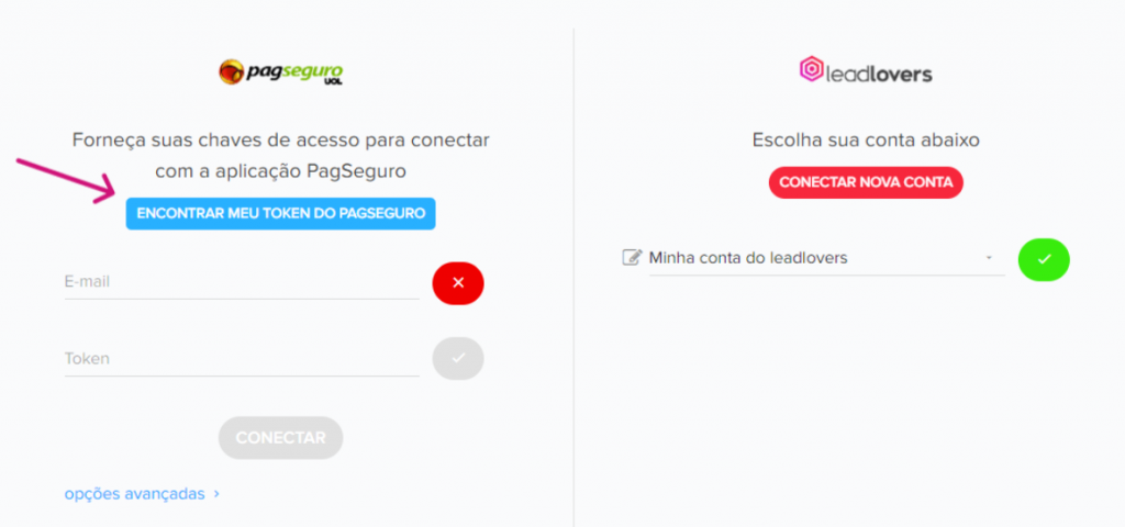 Em seguida, você vai conectar a sua conta do leadlovers e PagSeguro para que a Pluga consiga integrar as duas ferramentas. Caso tenha alguma dúvida, você pode consultar o tutorial que a Pluga disponibiliza para cada ferramenta escolhida, basta acessar aqui.