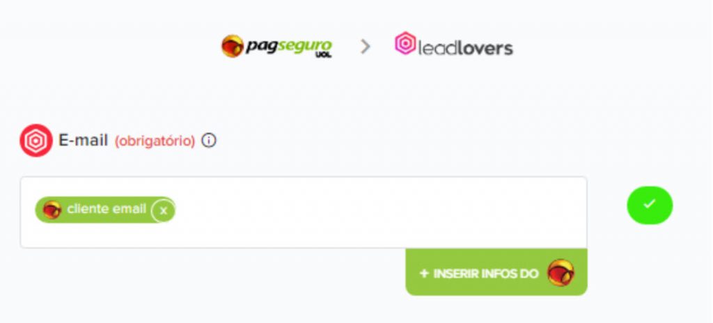 É nessa etapa que você vai dizer quais dados do PagSeguro irão para a leadlovers, a Pluga deixa uma série de campos já pré-definidos, mas você pode editá-los clicando no botão “Inserir infos do PagSeguro”.