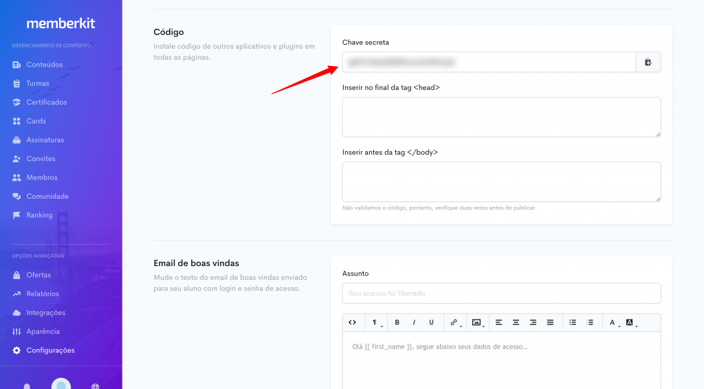 Obs: O token nada mais é do que uma chave de segurança que é utilizada para realizar a integração entre ferramentas. Copie a Chave Secreta de sua conta no MemberKit
