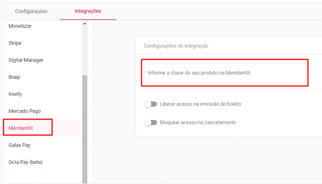 N10º – Na aba integrações, dentre as plataformas localize o MemberKit
