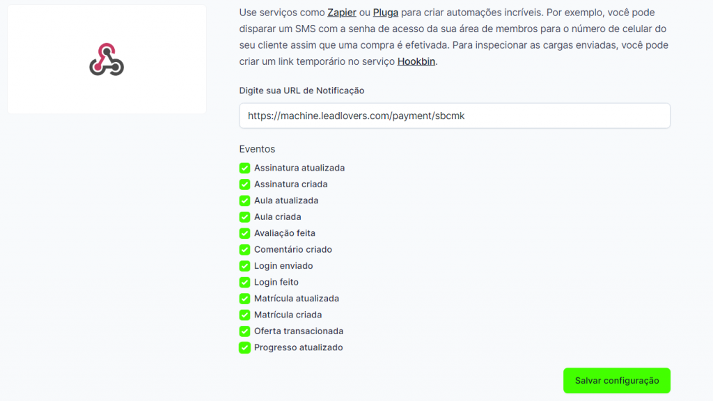 Após criar a URL de notificação e copiar o token no MemberKit, é preciso realizar as configurações dentro da leadlovers.