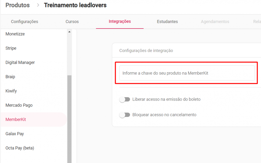 N13º No menu lateral, acesse Cursos online (EAD). N14º Localize seu produto, dentro do seu produto clique na aba Integrações.] N15º Dentre as plataformas, localize o MemberKit. N16º Adicione a chave secreta (token) no campo em branco. Depois clique em Salvar.