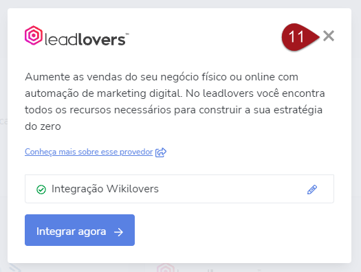 No próximo passo, aparecerá uma marca de verificação ao lado do nome da integração que foi criada indicando que está tudo certo. Basta fechar o pop-up para prosseguir.