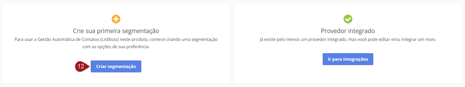 Retorne novamente a tela inicial de integrações, localize o quadro “Crie sua primeira segmentação” e clique no botão “Criar segmentação”.