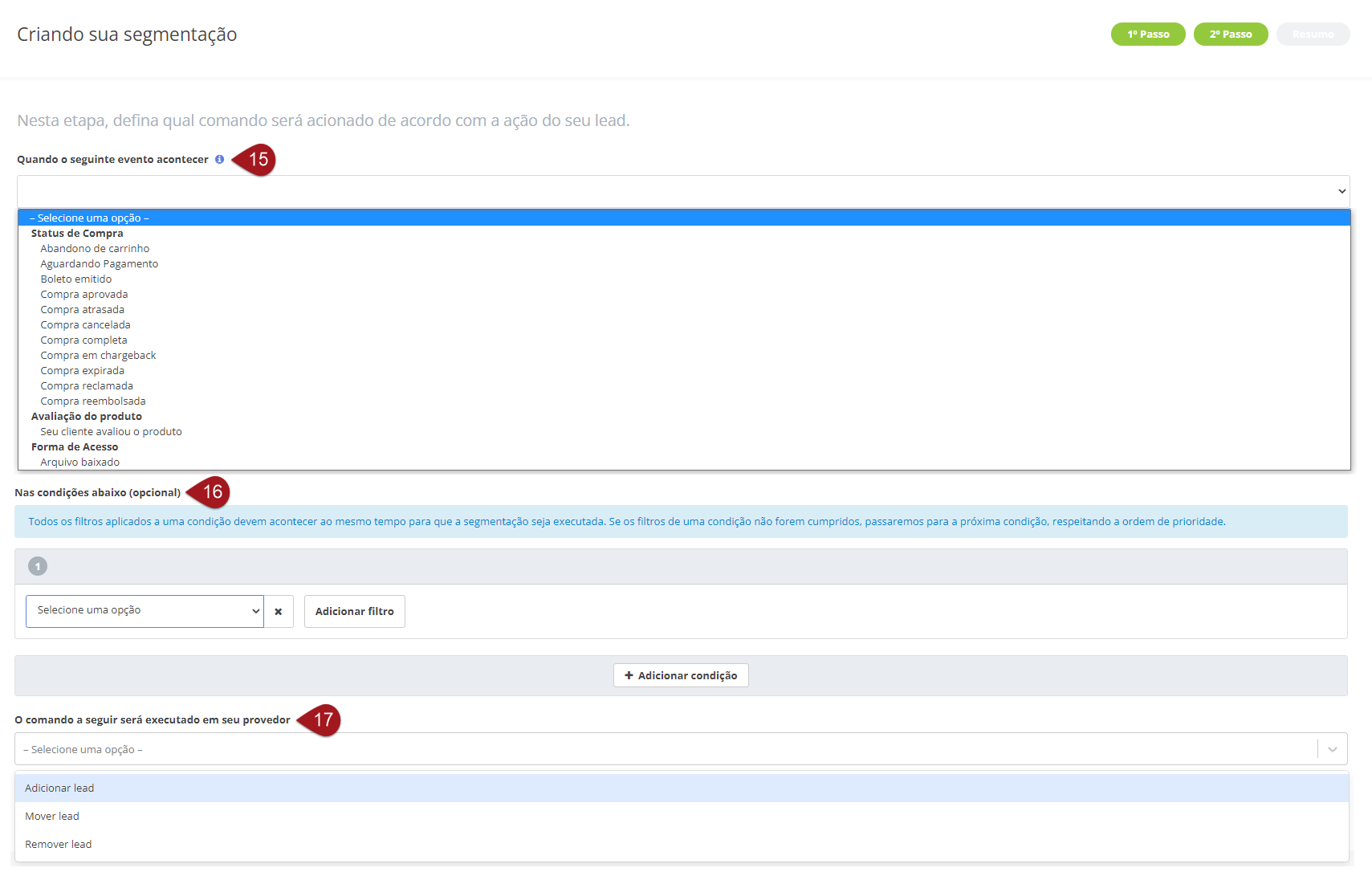 Em “O comando a seguir será executado em seu provedor” escolha qual ação será executada sobre o lead, são elas: “Adicionar lead”, “Mover lead” e “Remover lead”. Falaremos mais sobre cada uma adiante.