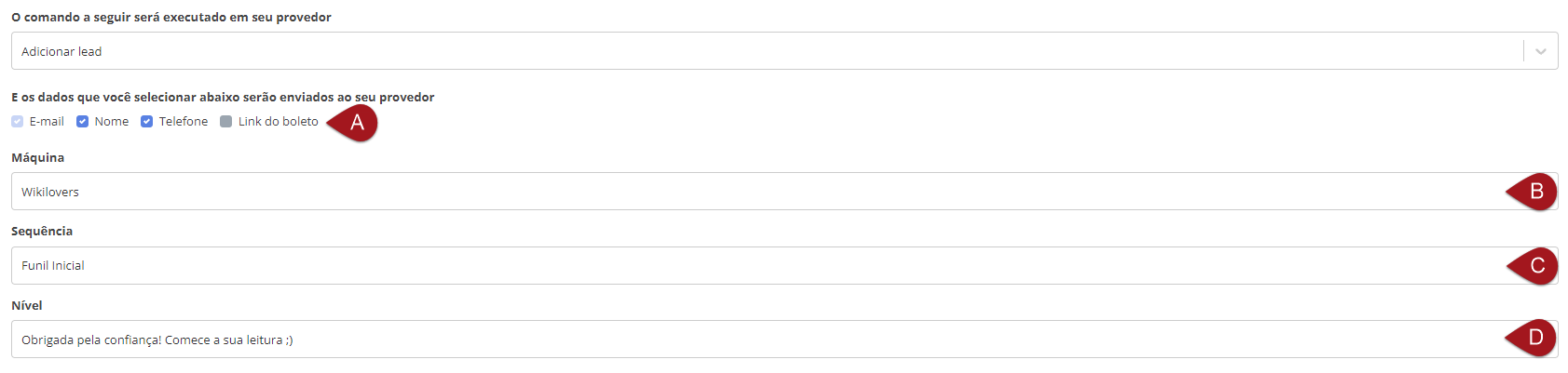 A– Ao escolher este comando, você deve decidir quais dados serão enviados para a leadlovers. As opções são: “E-mail”, “Nome”, “Telefone”, “Link do boleto”.