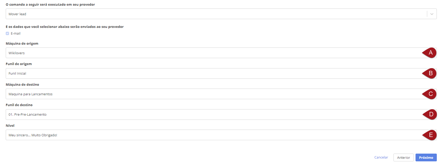 C– Agora escolha a sua máquina de destino. Em outras palavras, para onde o lead será movido.