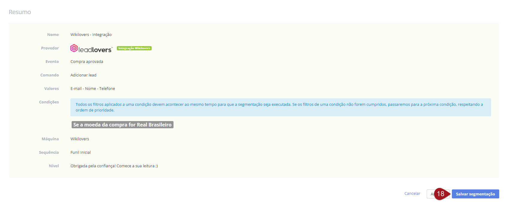 Nº18– Você será direcionado para um resumo das configurações criadas. Confira os dados e clique em “Salvar segmentação”.