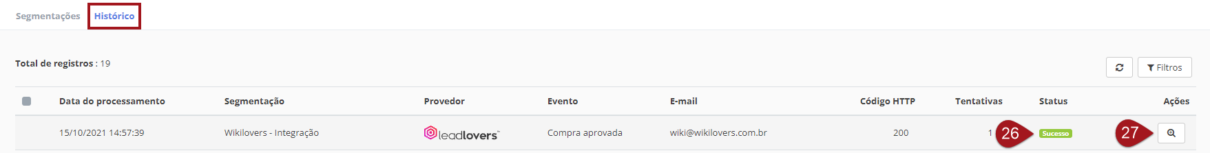 Vá na opção “Histórico” na sua janela de segmentações do ListBoss (a que mostramos logo após o passo 25) e verifique se na coluna “Status” do teste feito está com a informação “Sucesso”.