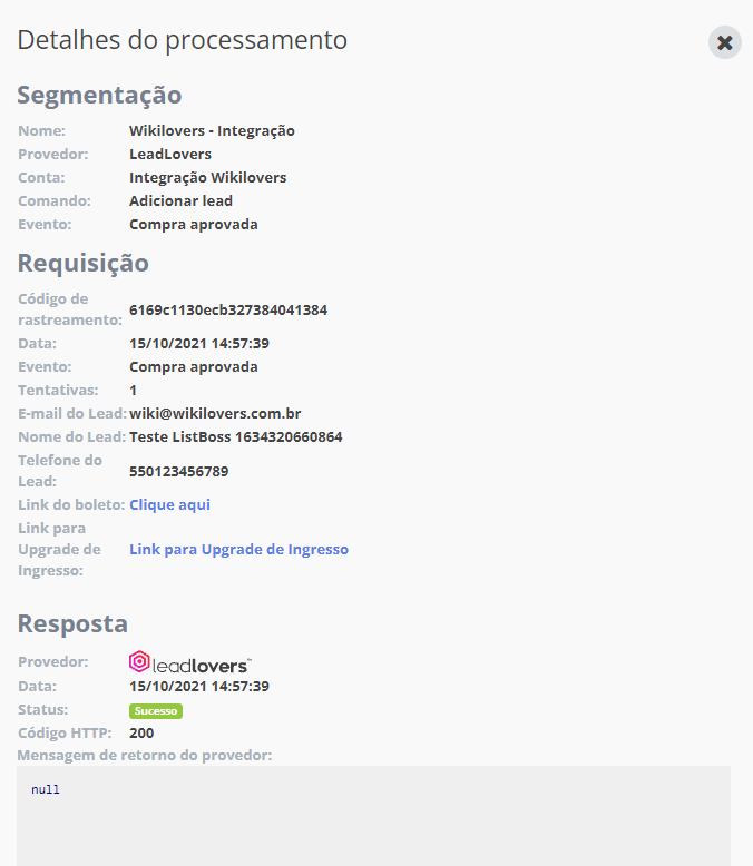 Na janela que abrir, será possível verificar todos os detalhes do teste executado. Da mesma forma, você pode usar a aba “Histórico” e esta tela de detalhes para ver também os futuros acionamentos reais desta integração.