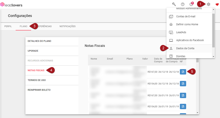 1 – Clique em Configurações 2 – Clique em Dados da Conta 3 – Clique em Planos e será mostrado as informações do seu plano base atual e de qualquer upgrade que você já tenha 4 – Em seguida clique em NOTAS FISCAIS, no menu lateral esquerdo 5 – Clique no ícone da NF desejada para baixa-la