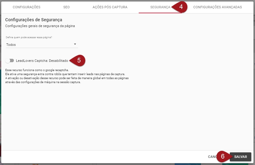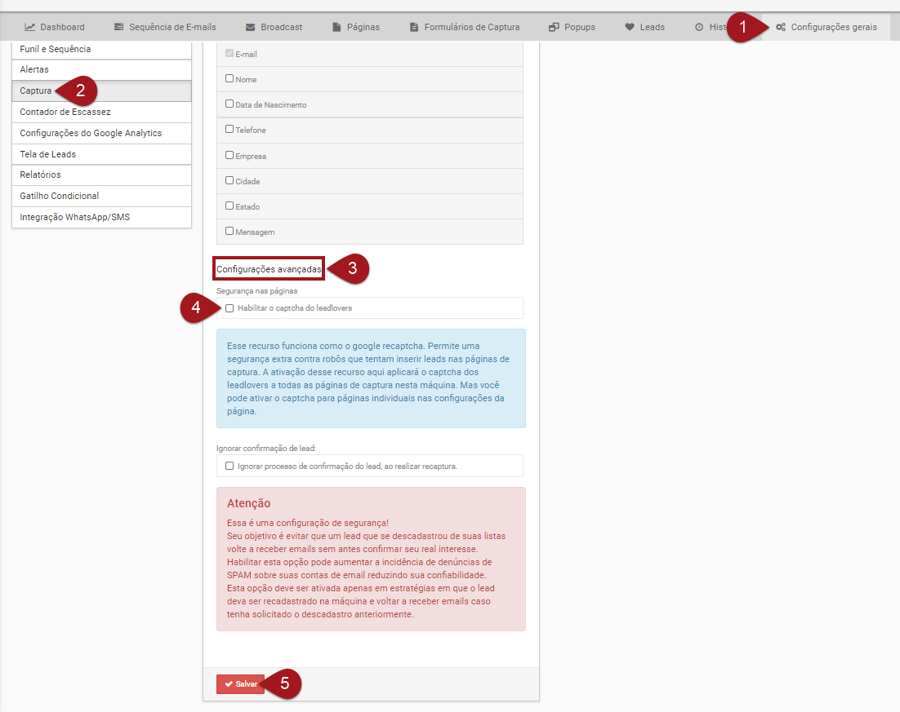 Agora, caso queira utilizar o Captcha em todas as páginas de captura de sua máquina, você consegue já deixar isso definido nas configurações gerais da máquina.