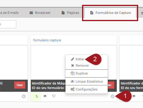 Nº1– Na aba Formulários de Captura da máquina, clique na engrenagem ⚙ .
